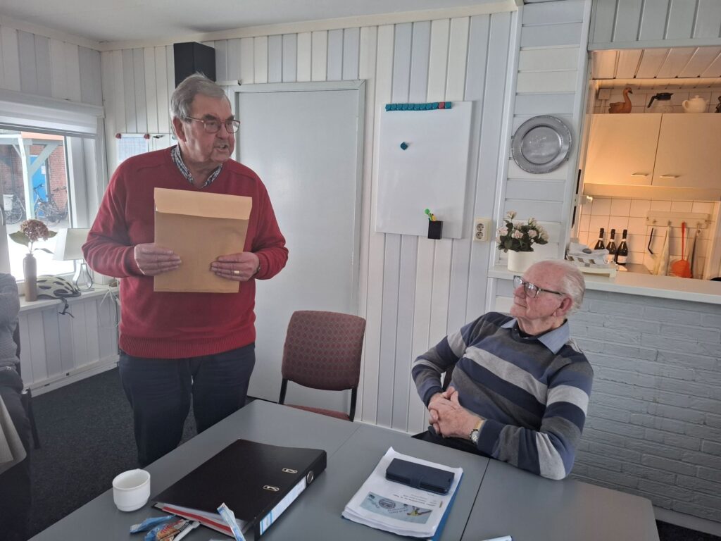 Als dank voor zijn vele bestuursjaren als penningmeester en later als voorzitter overhandigt Jan Harms (penningmeester) Gezienus een envelop met daarin vier kleinere enveloppen, waarvoor hij enkele keren de innerlijke mens op culinaire manier kan verwennen.