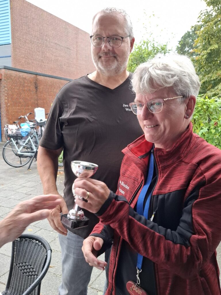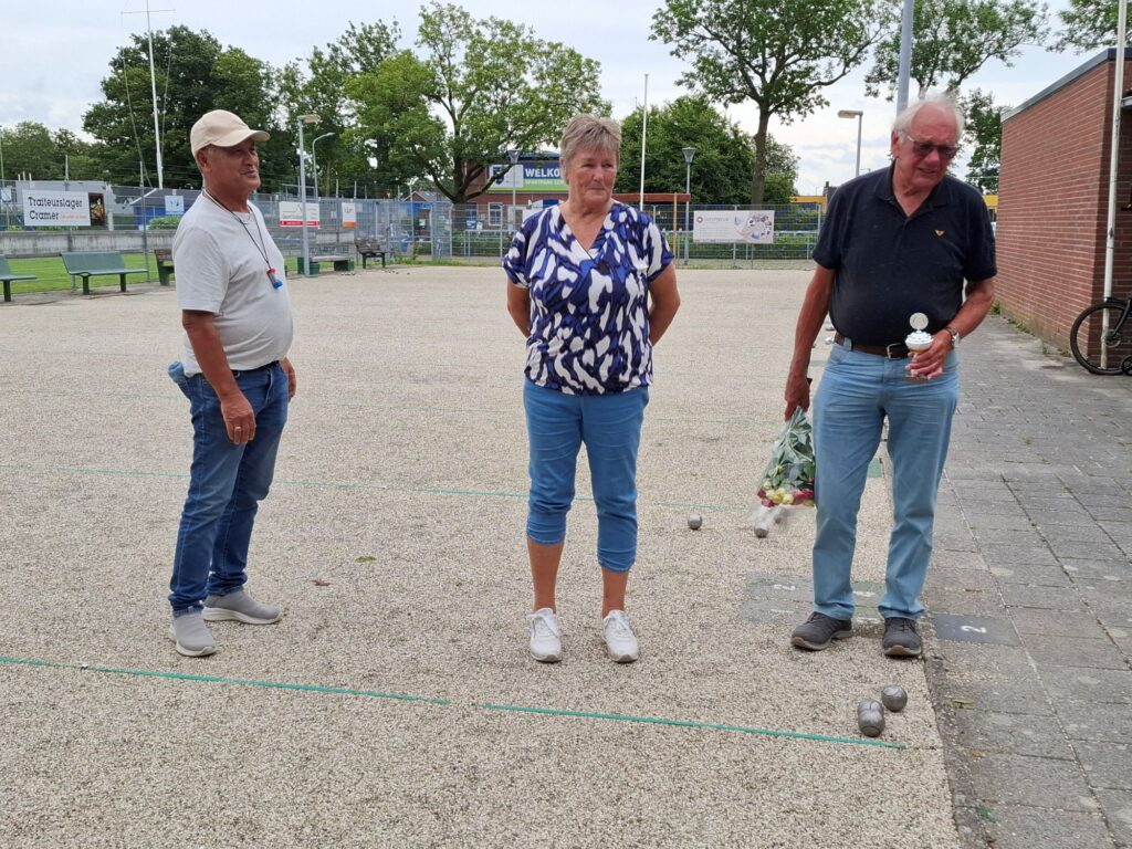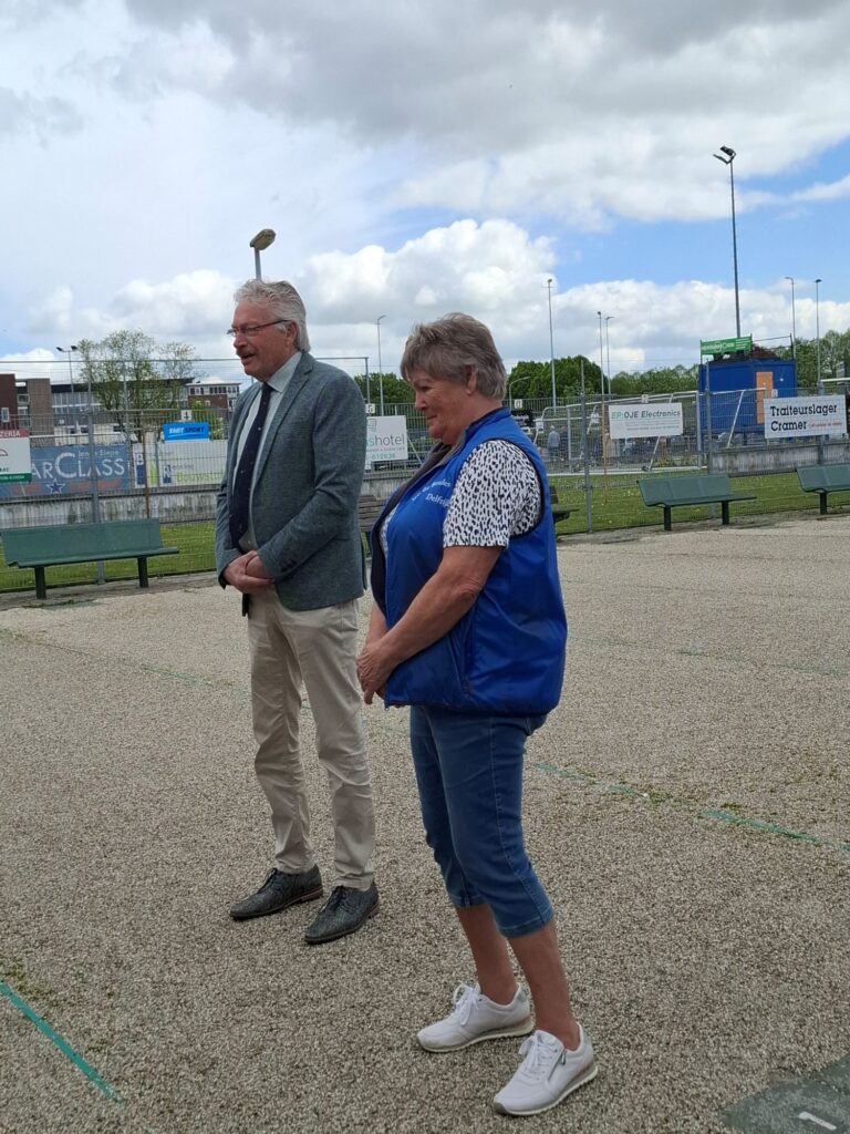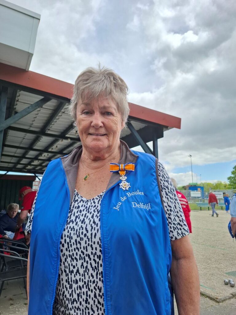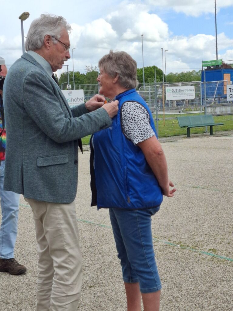 Op zaterdag 3 mei werd in Delfzijl het Bevrijdingstoernooi gespeeld. Dit was een zeer bijzondere gebeurtenis, want er werd niet alleen gebouled, maar het was ook de dag waarop aan Gieny de Vries een koninklijke onderscheiding uitgereikt werd. Jan Menninga kwam het toernooi bezoeken om in de omgeving waar Gieny zich opperbest voelt de plechtigheid te voltrekken. En zo heeft Gieny als één van de mede oprichters van de Jeu de Boules vereniging Delfzijl en tevens als zeer verdienstelijk beheerder van de kantine tijdens het toernooi haar welverdiende lintje in ontvangst mogen nemen. Na deze feestelijke onderbreking werd het toernooi hervat en dat leverde de volgende foto’s op.